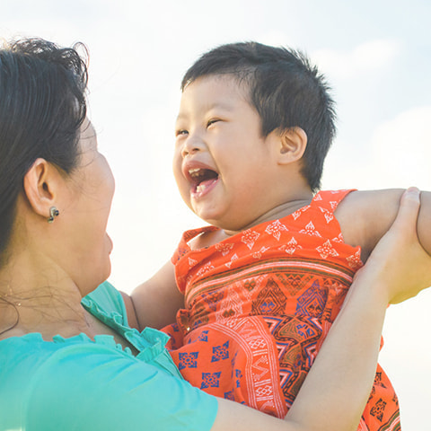 of young children with Down syndrome and their happy families.