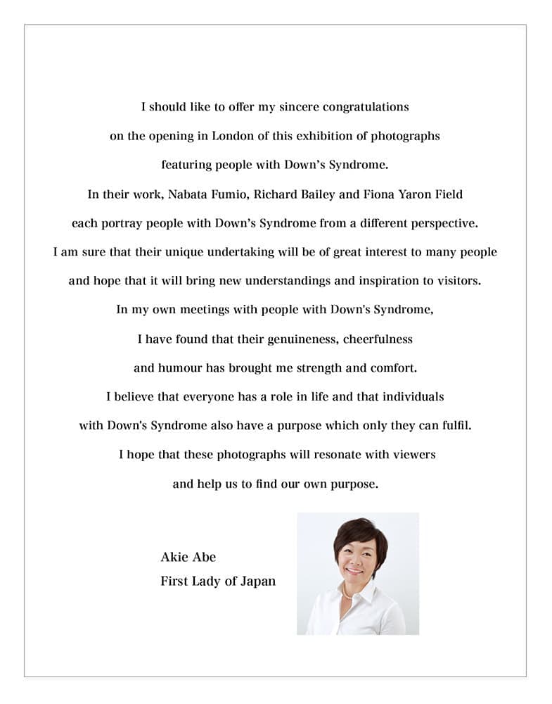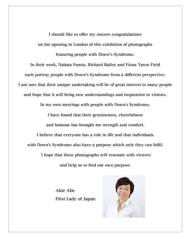 We have received a recommendation letter from Mrs. Akie Abe for our photo exhibition "Positive Energies" to be held in London. She is First Lady of Japan.