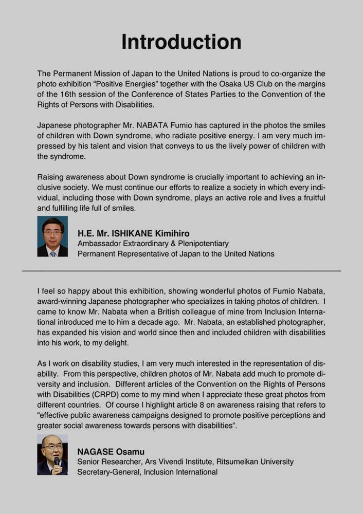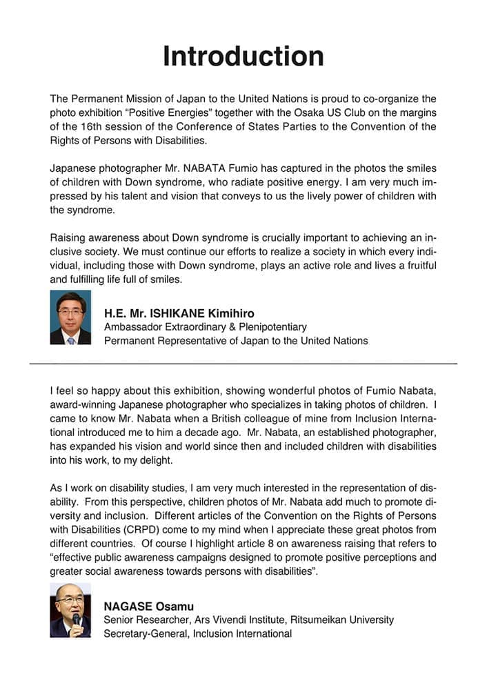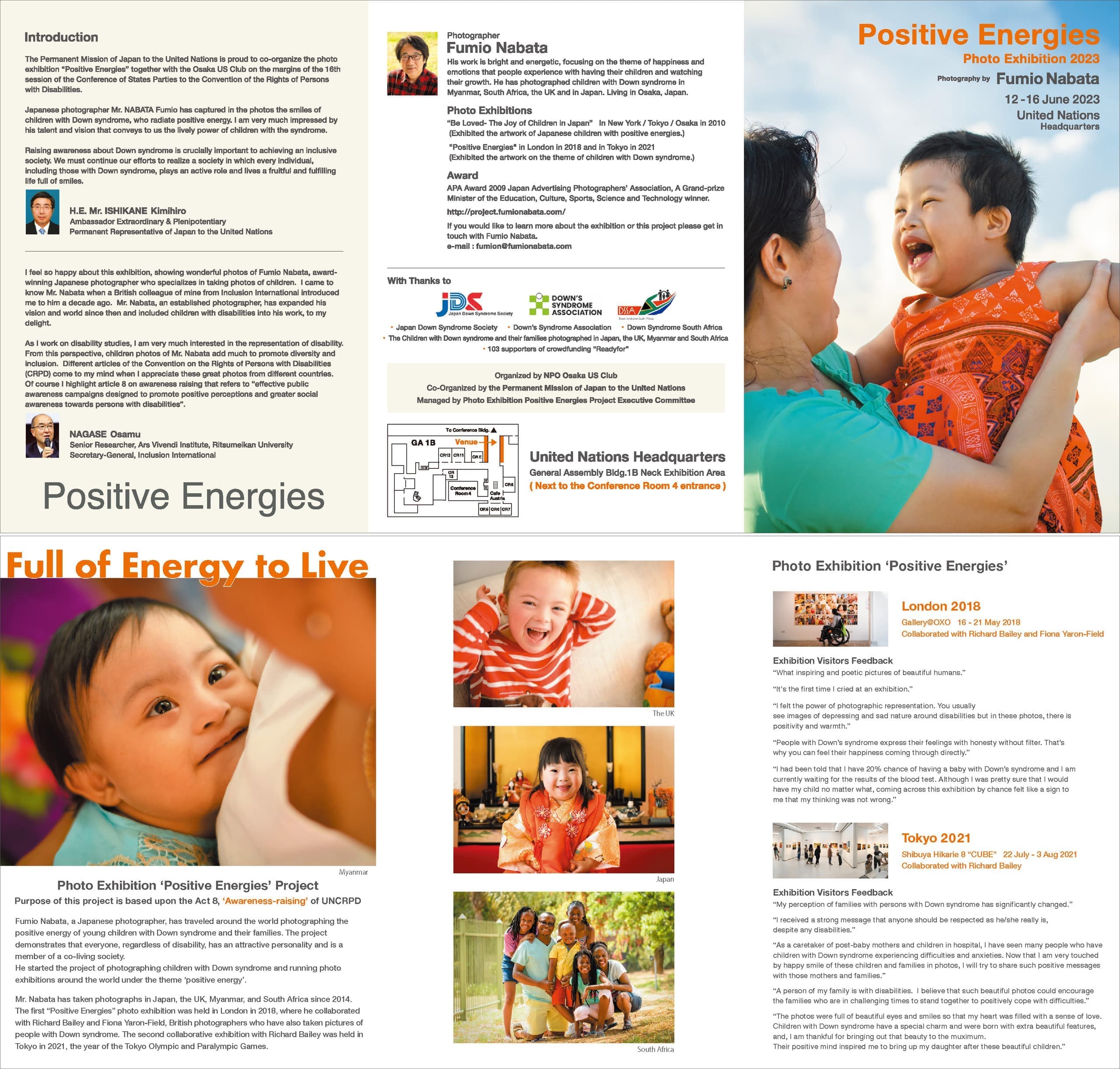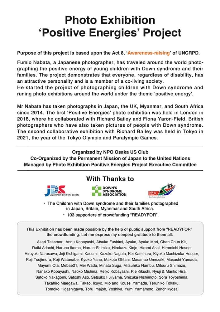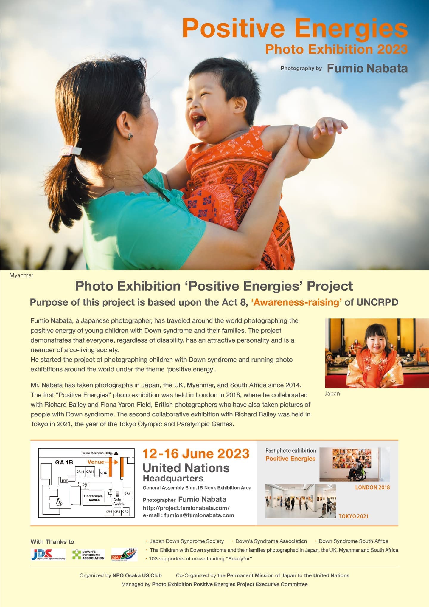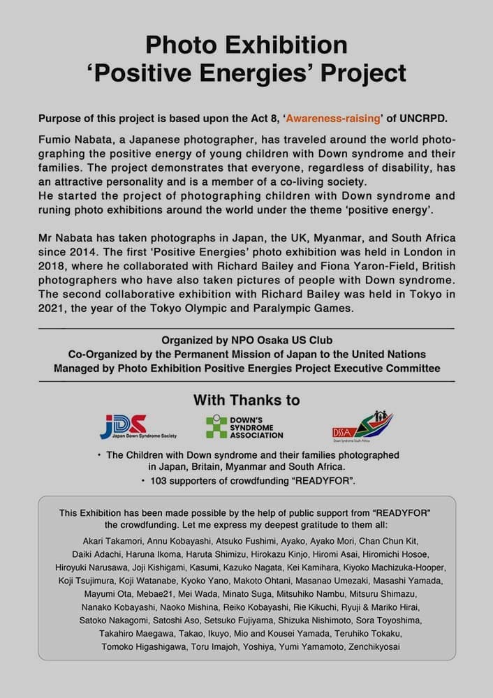 Photo Exhibition ‘Positive Energies’ at the United Nations Photography by Fumio Nabata Organized by NPO Osaka US Club Co-organized by the Permanent Mission of Japan to the United Nations Managed by Photo Exhibition Positive Energies Project Executive Committee Date: 12-16 June 2023 Venue: General Assembly Bldg. 1B Neck Exhibition Area in the United Nations Headquarters. Address: 406 E 42nd St, New York, United States Supported by Japan Down Syndrome Society Down’s Syndrome Association Down Syndrome South Africa