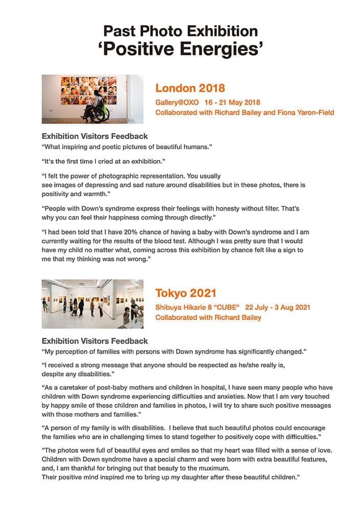 “As a caretaker of post-baby mothers and children in hospital, I have seen many people who have children with Down syndrome experiencing difficulties and anxieties. Now that I am very touched by happy smile of these children and families in photos, I will try to share such positive messages with those mothers and families.” “I received a strong message that anyone should be respected as he/she really is, despite any disabilities.”